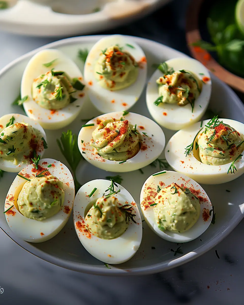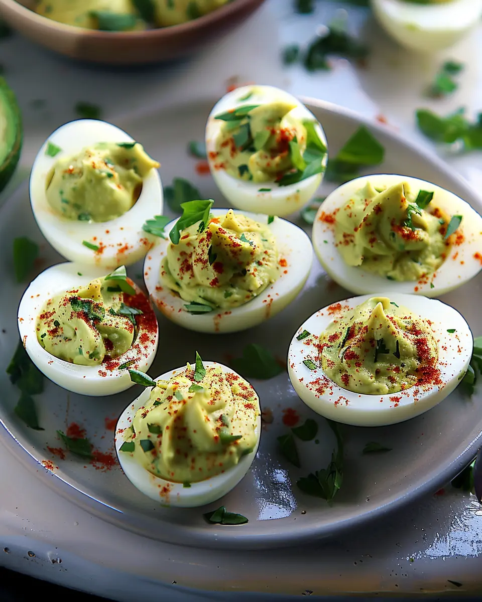 There you have it—a simple yet sophisticated appetizer that’s perfect for any occasion! Not only are these Avocado Deviled Eggs delicious, but they also pack a nutritional punch. Avocados are high in heart-healthy fats, potassium, and fiber, making this a guilt-free indulgence that your friends and family will love. Want to elevate your event? Pair them with sparkling water infused with fresh fruits for a refreshing drink. Enjoy!