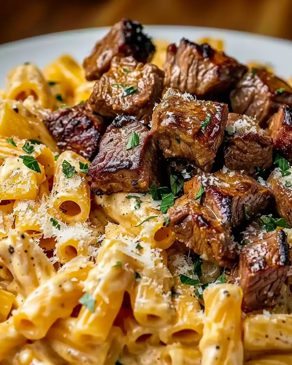 Delight your taste buds with these Cajun Steak Tips served in a rich and creamy Cheesy Rigatoni Parmesan Sauce.