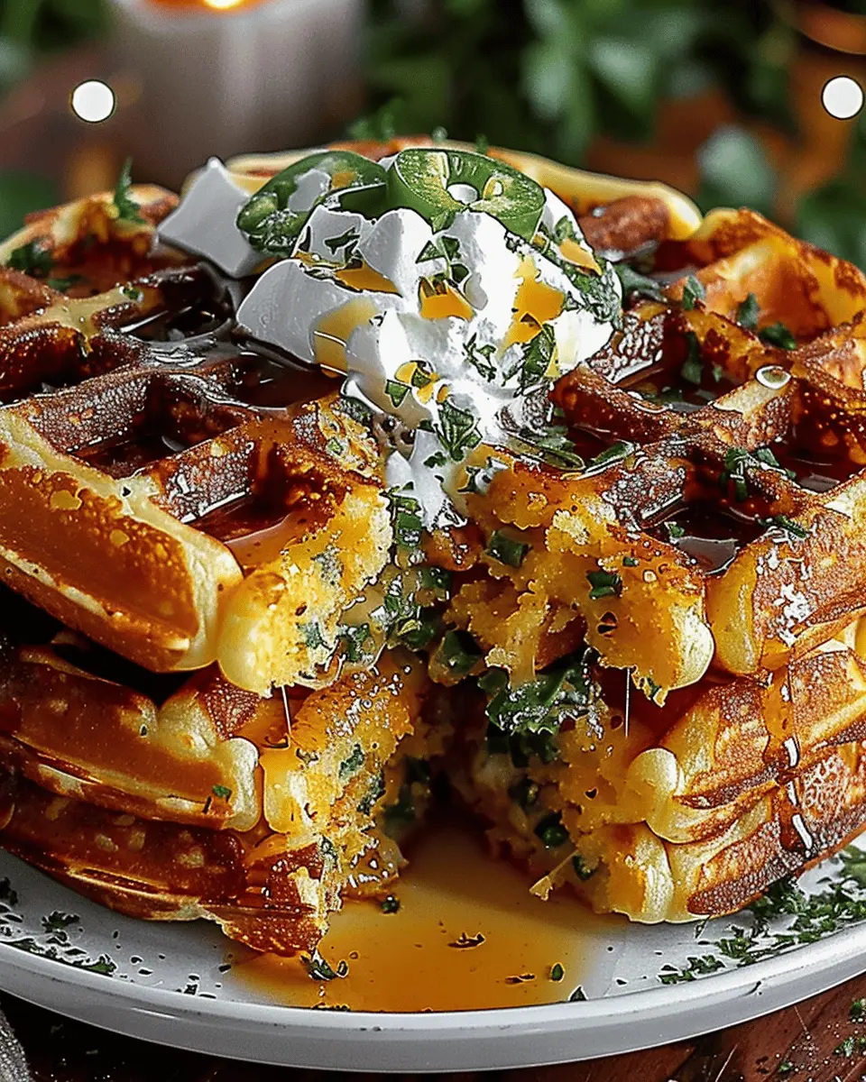 Cheddar Jalapeño Cornbread Waffles combine the sweetness of cornbread batter with the spice of jalapeños, creating a perfect breakfast treat.