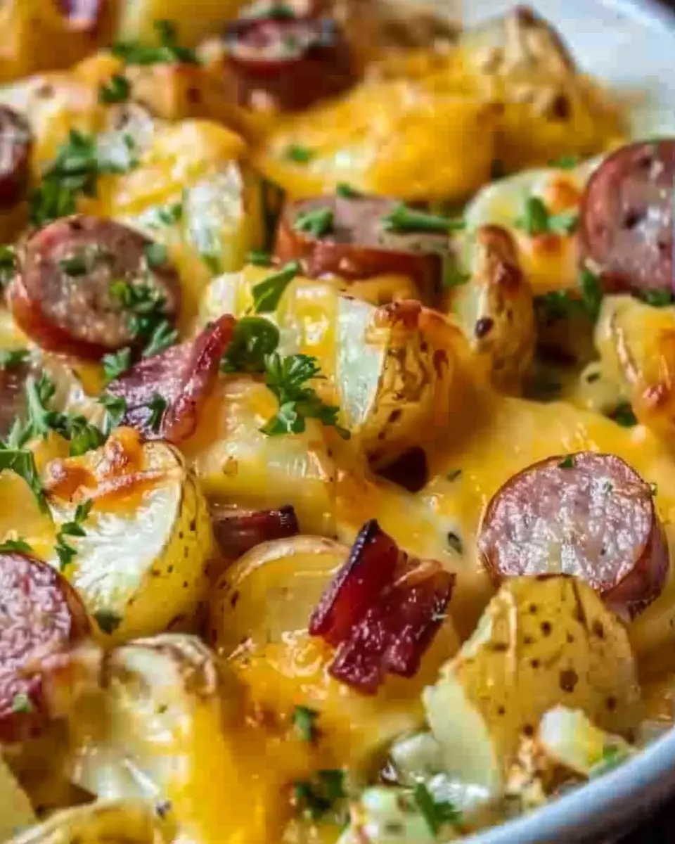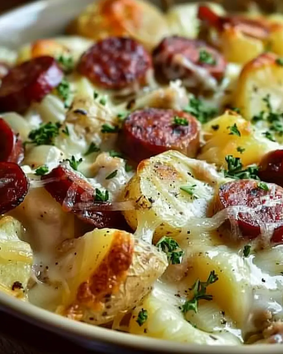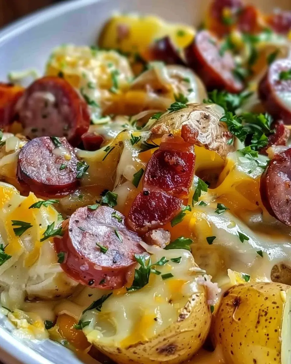 A delightful dish combining cheesy flavors, ranch seasoning, tender potatoes, and smoked sausage for a comforting meal.