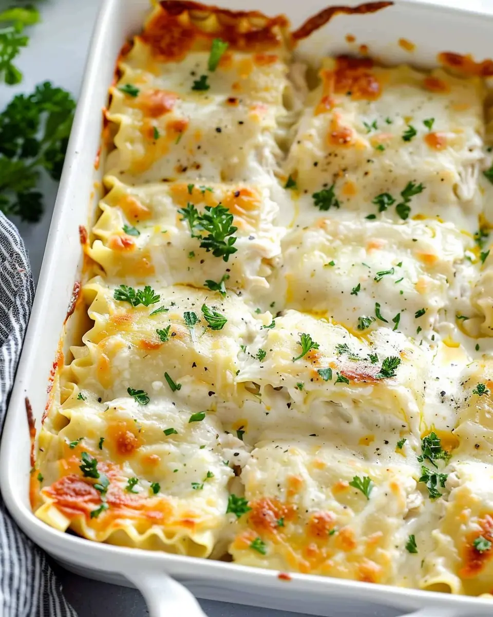 Indulge in the creamy goodness of Chicken Alfredo Lasagna Rolls, perfect for a comforting meal.