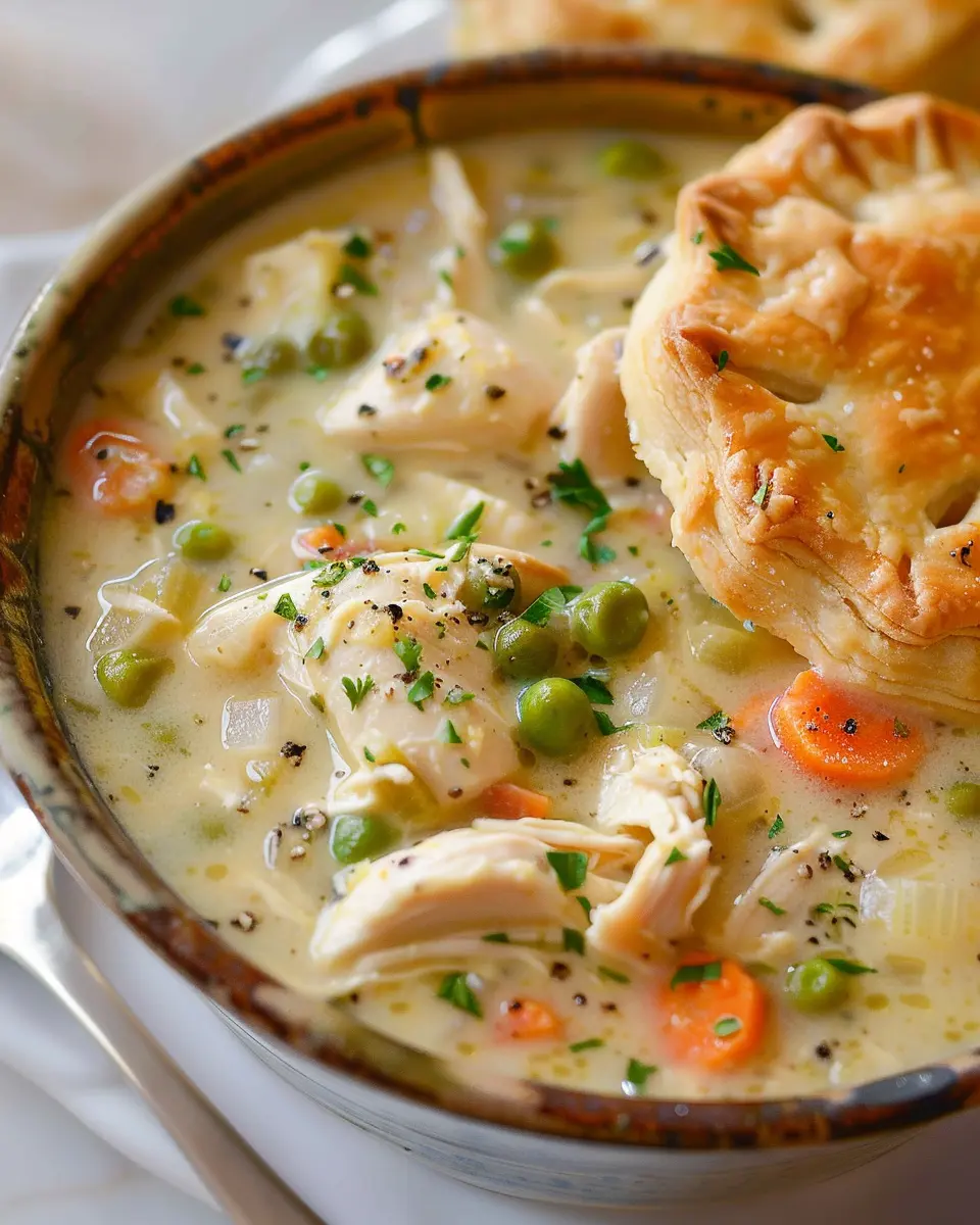 A comforting chicken pot pie soup recipe featuring turkey bacon for a delightful twist.