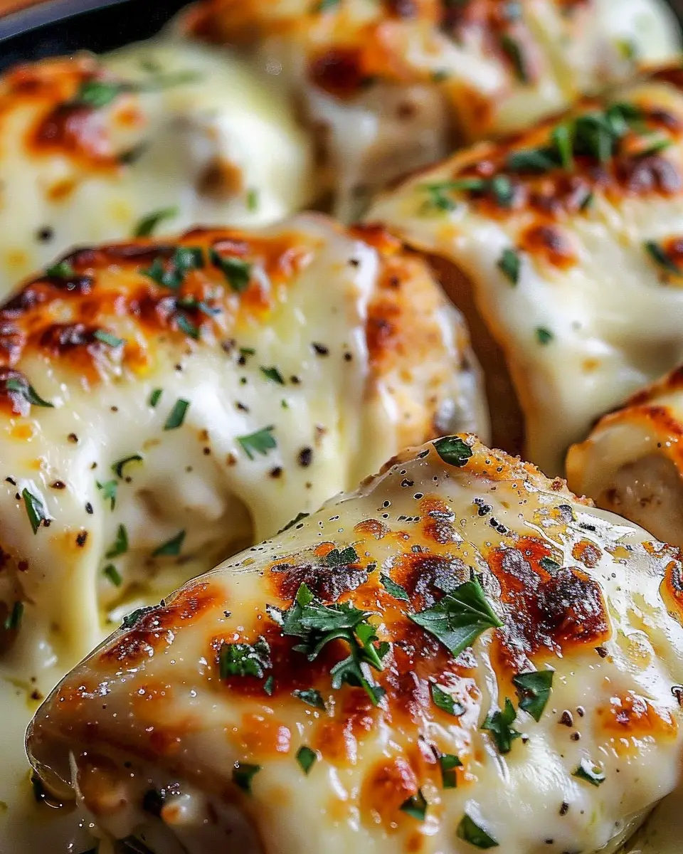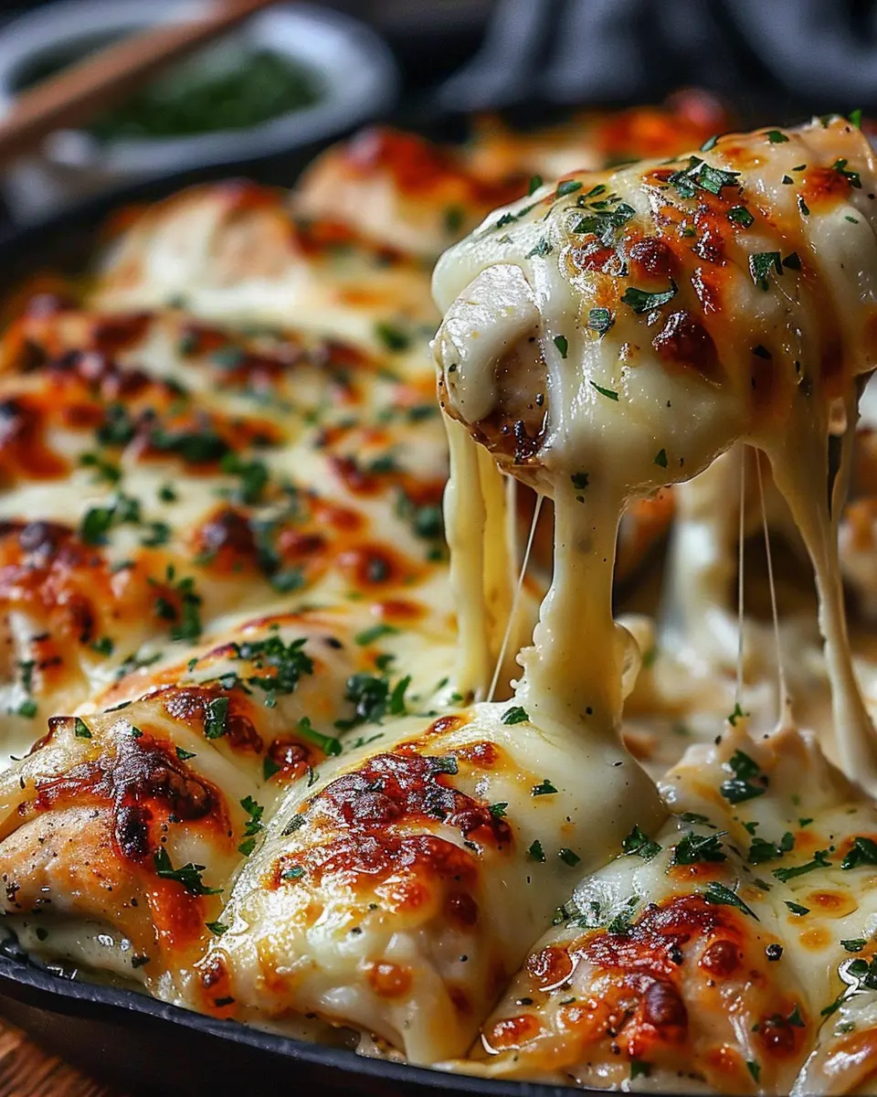 A deliciously creamy and cheesy chicken dish infused with garlic, perfect for a comforting meal.