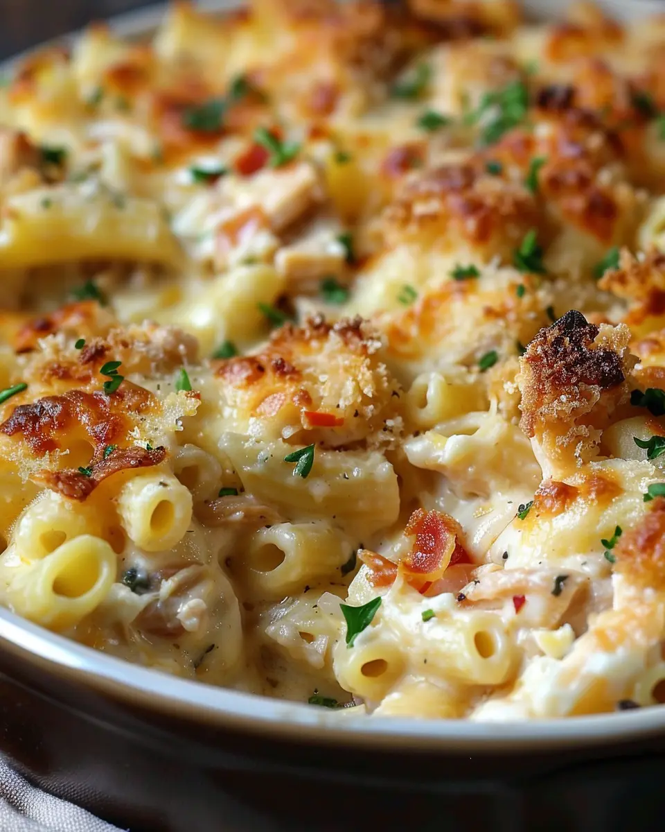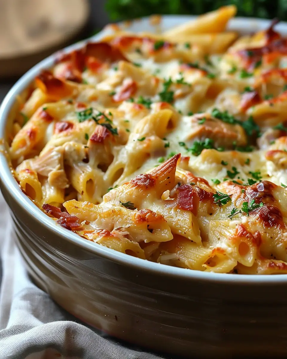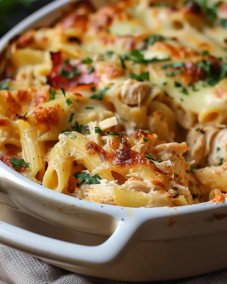 A comforting and delicious chicken pasta casserole with a twist of turkey bacon.