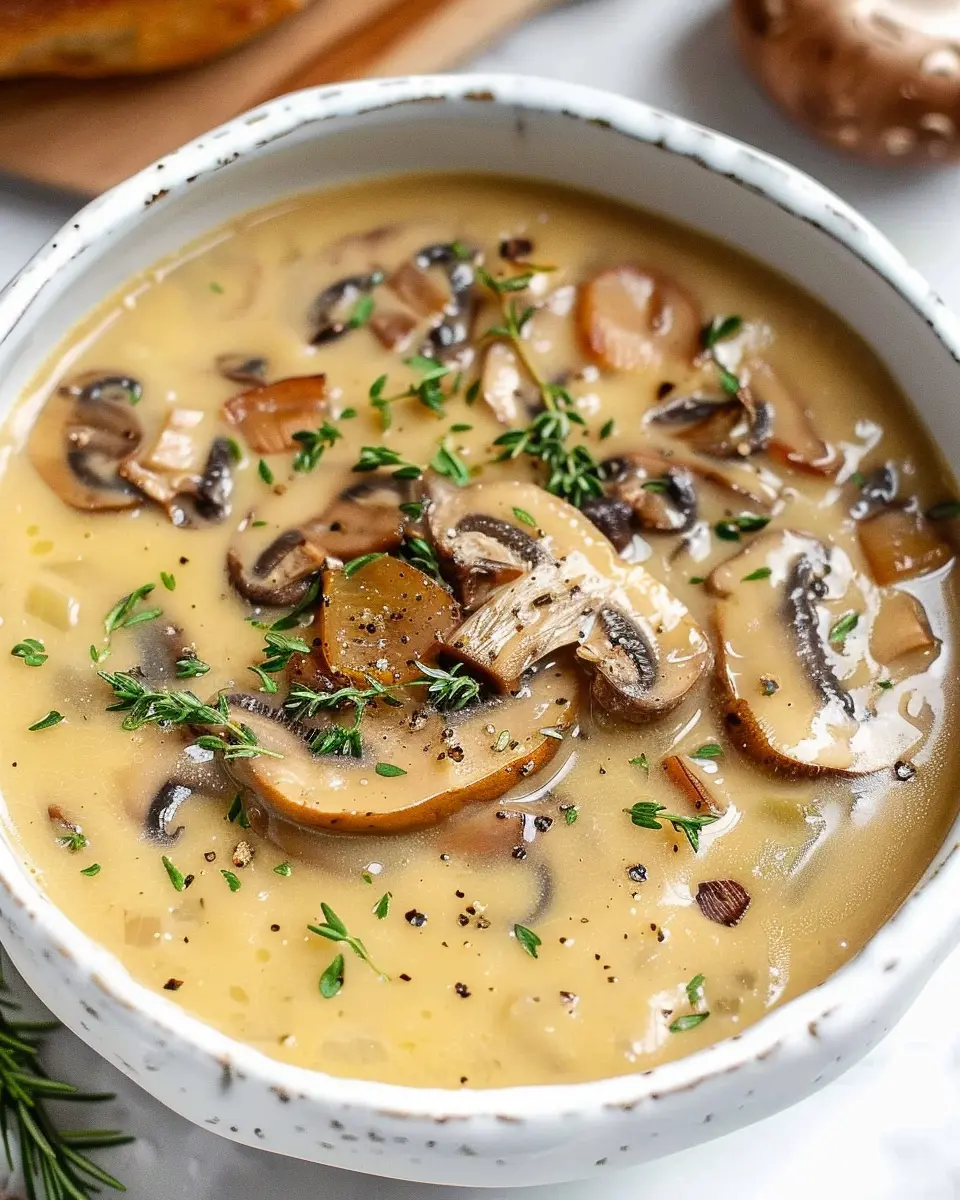 A creamy and comforting soup made with turkey bacon and fresh mushrooms, perfect for chilly days.