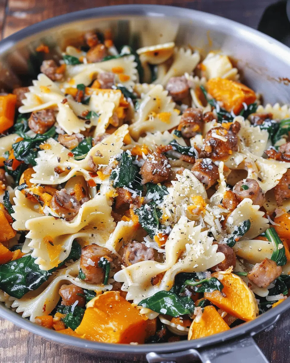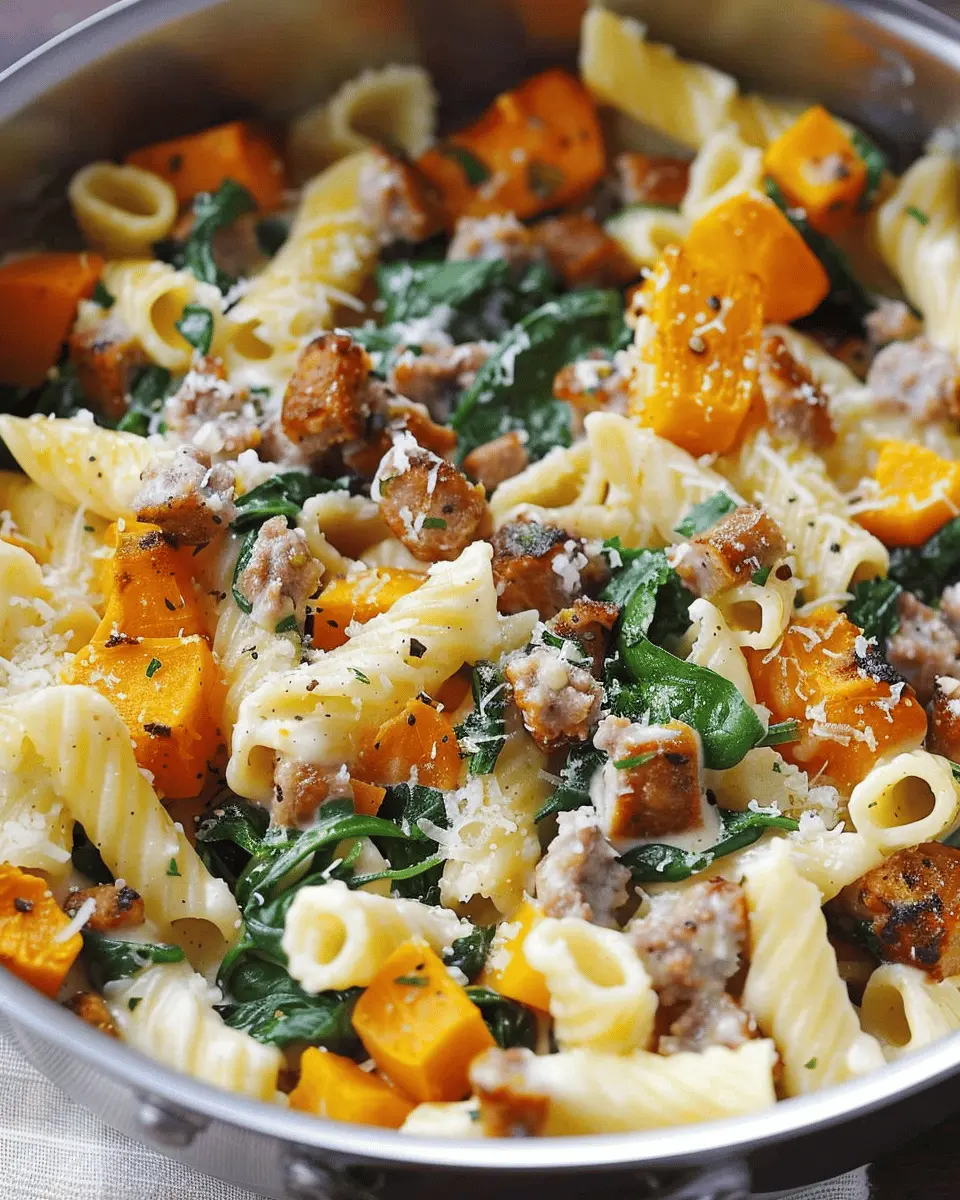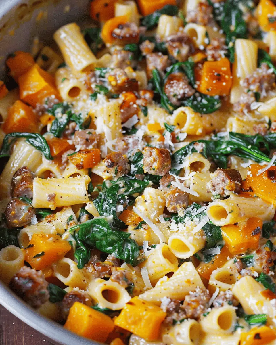 A comforting and creamy pasta dish featuring roasted butternut squash, savory sausage, and fresh spinach.