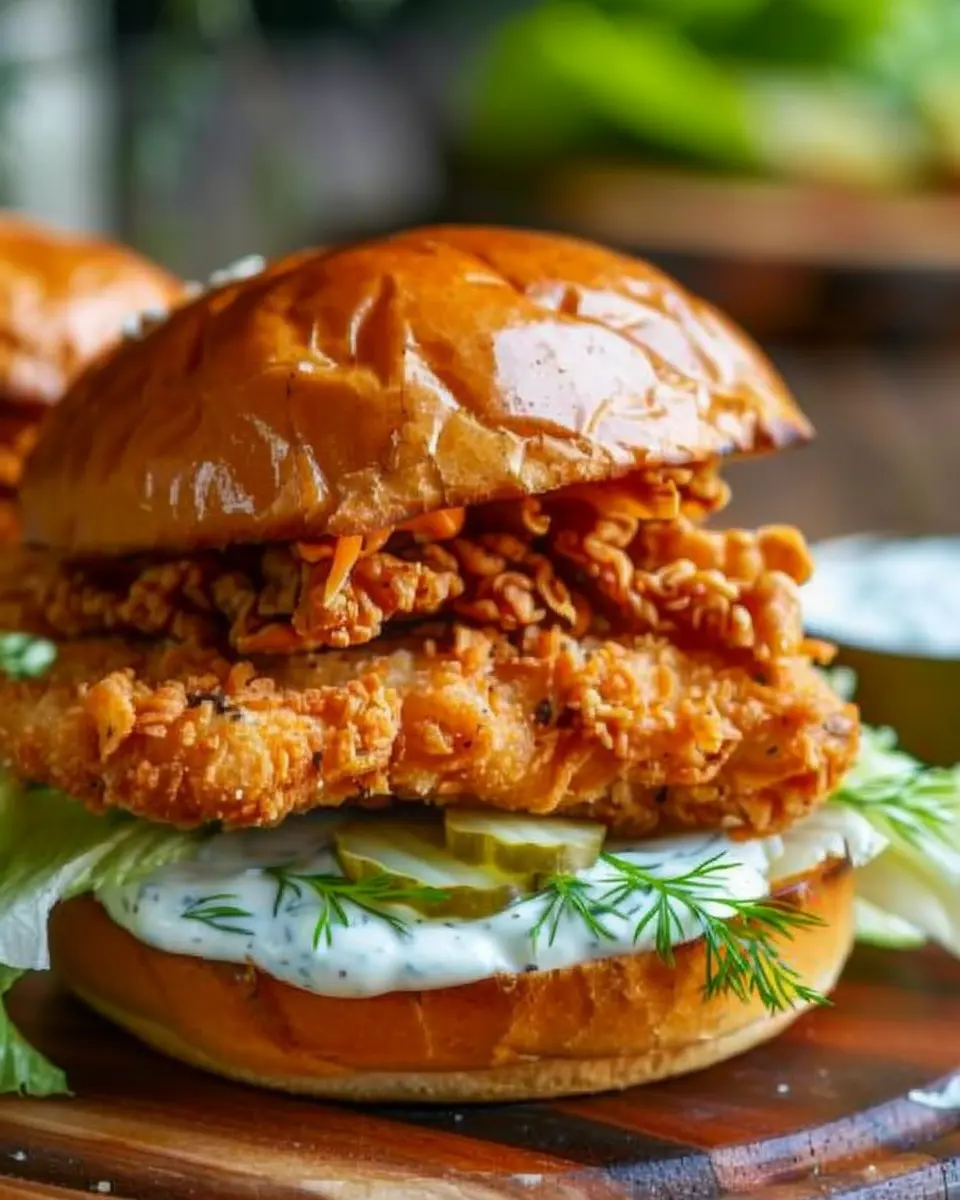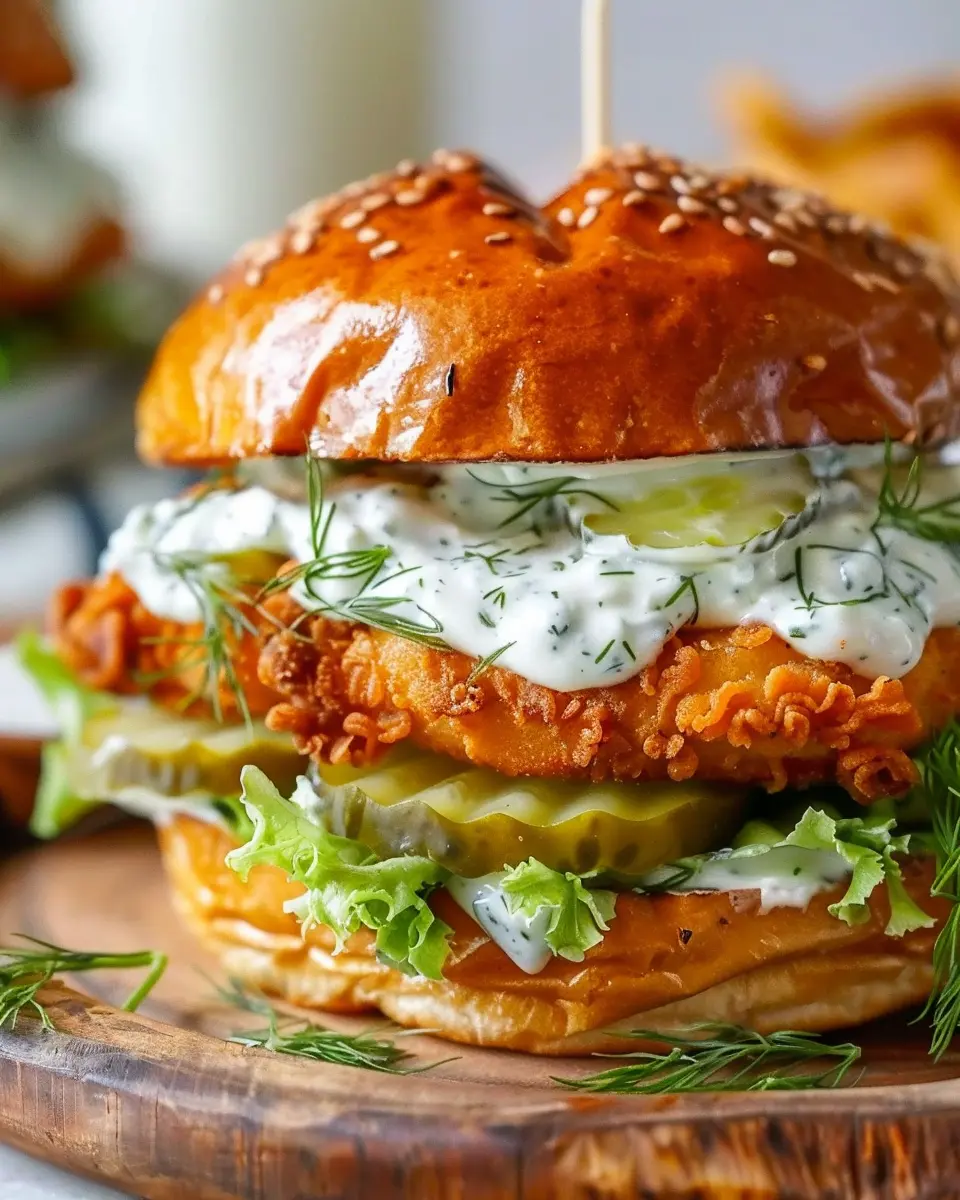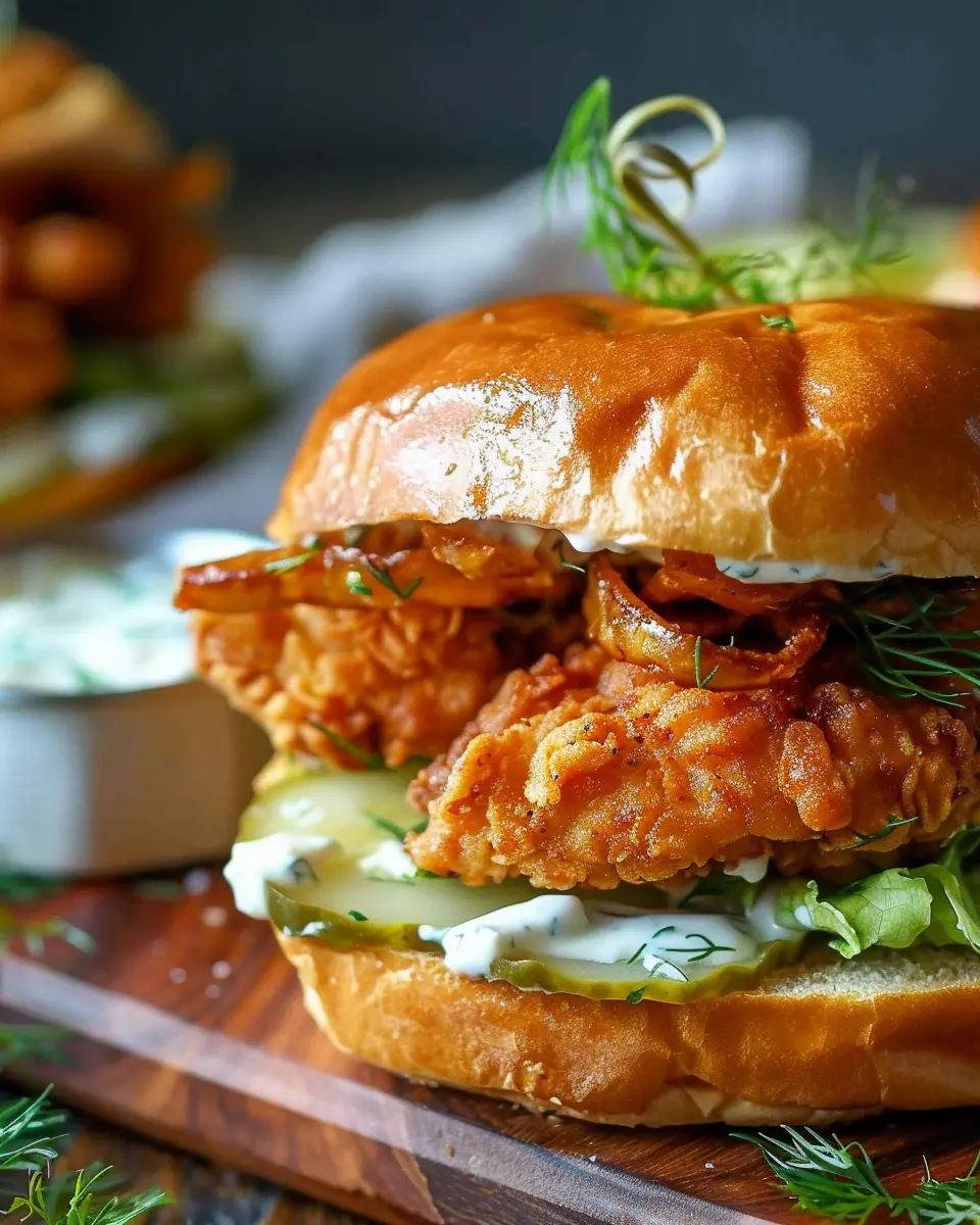 Finally, crown your creation with the top bun, serve, and dig in while it’s hot! This crispy dill chicken sandwich isn’t just a meal; it’s an experience. Pair it with some sweet potato fries or a fresh salad to round out your meal. Enjoy every crunchy, savory bite, and be prepared for compliments!