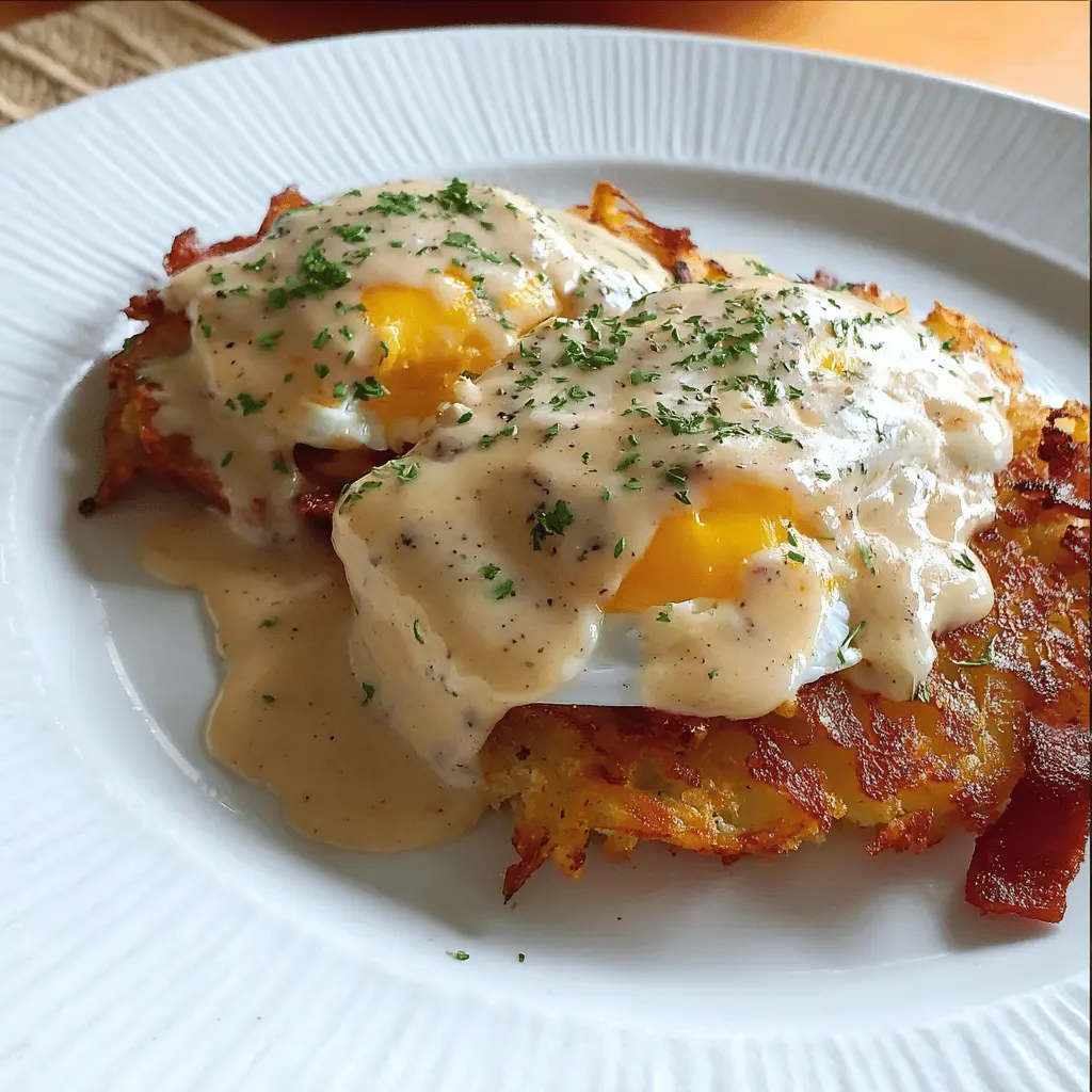 Indulge in a hearty breakfast with Egg Topped Hash Browns and Turkey Bacon Gravy, the perfect comfort food for any morning.