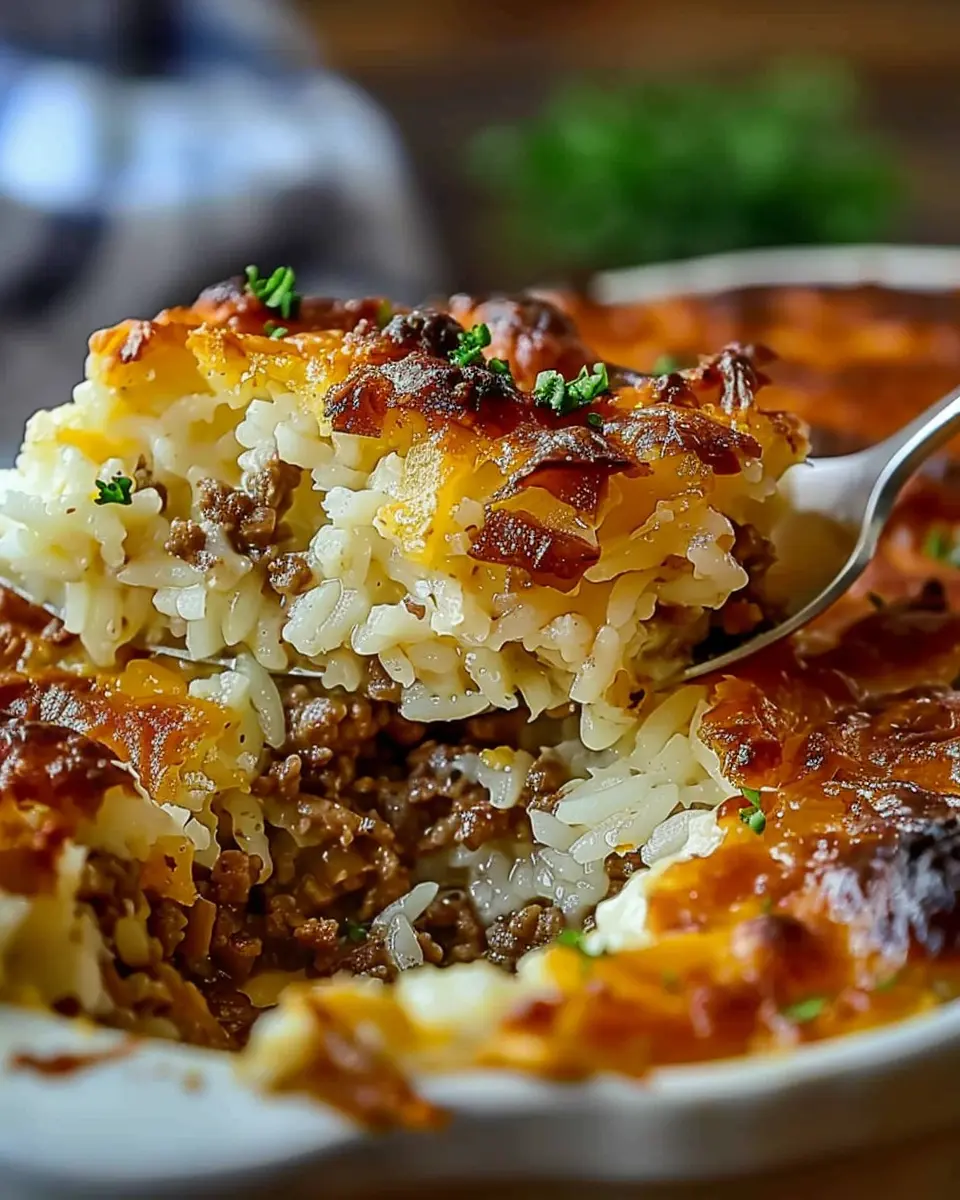 A hearty and flavorful casserole that combines ground beef, rice, and the rich taste of French onion, topped with crispy turkey bacon.
