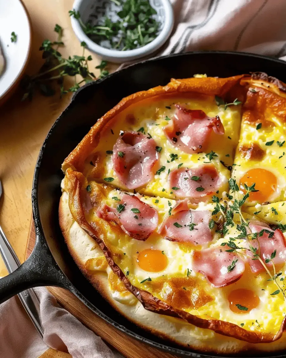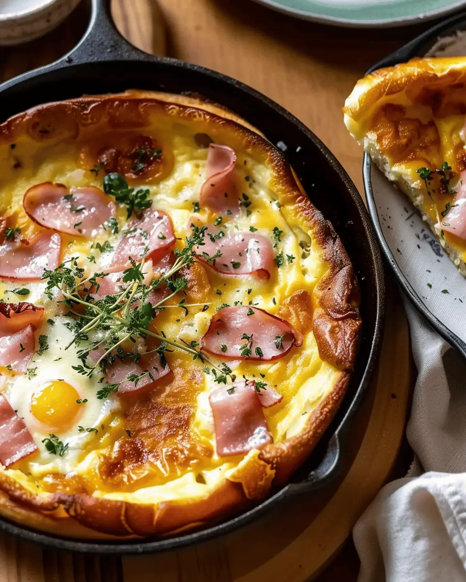 A delightful take on the traditional Dutch baby, incorporating savory chicken ham and turkey bacon for a delicious breakfast or brunch.