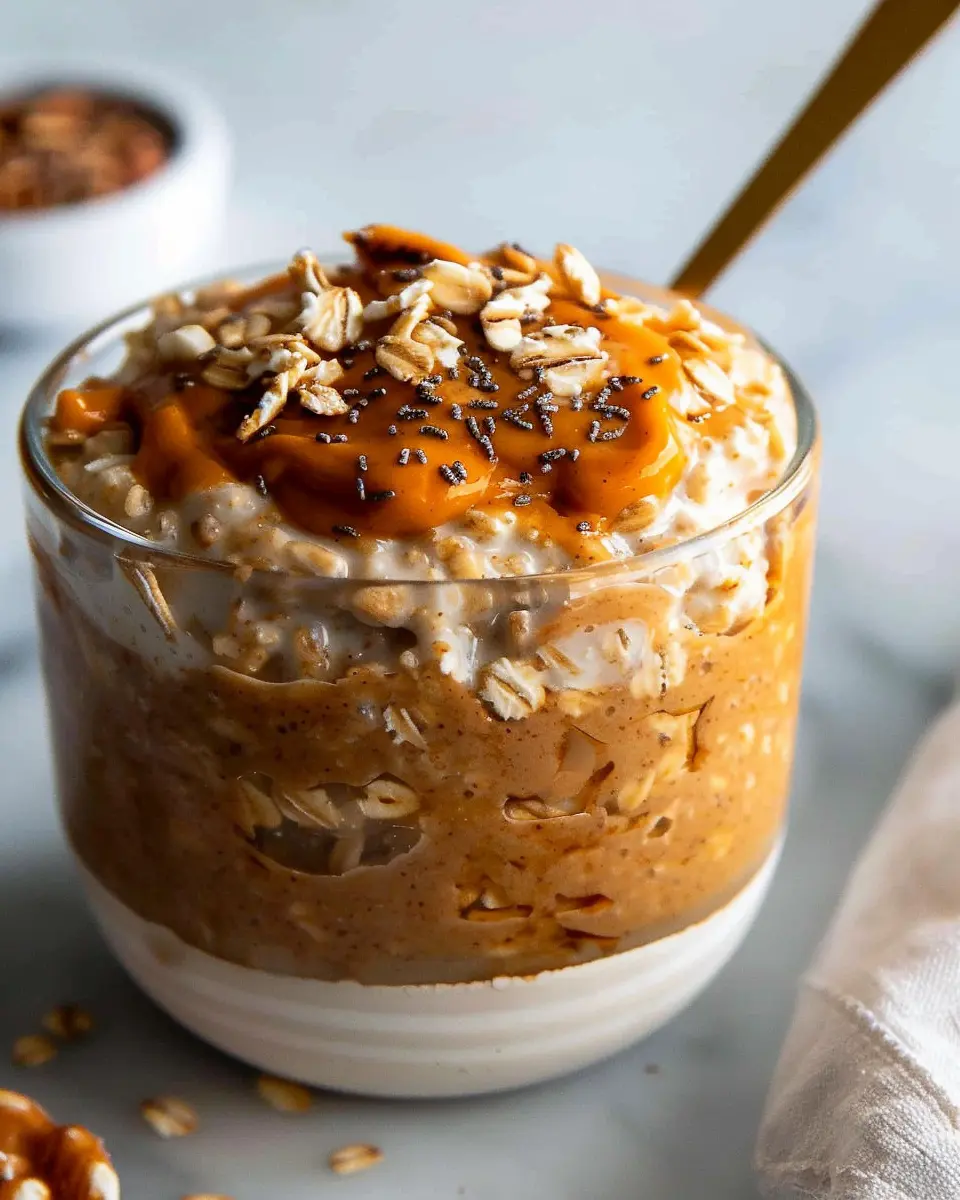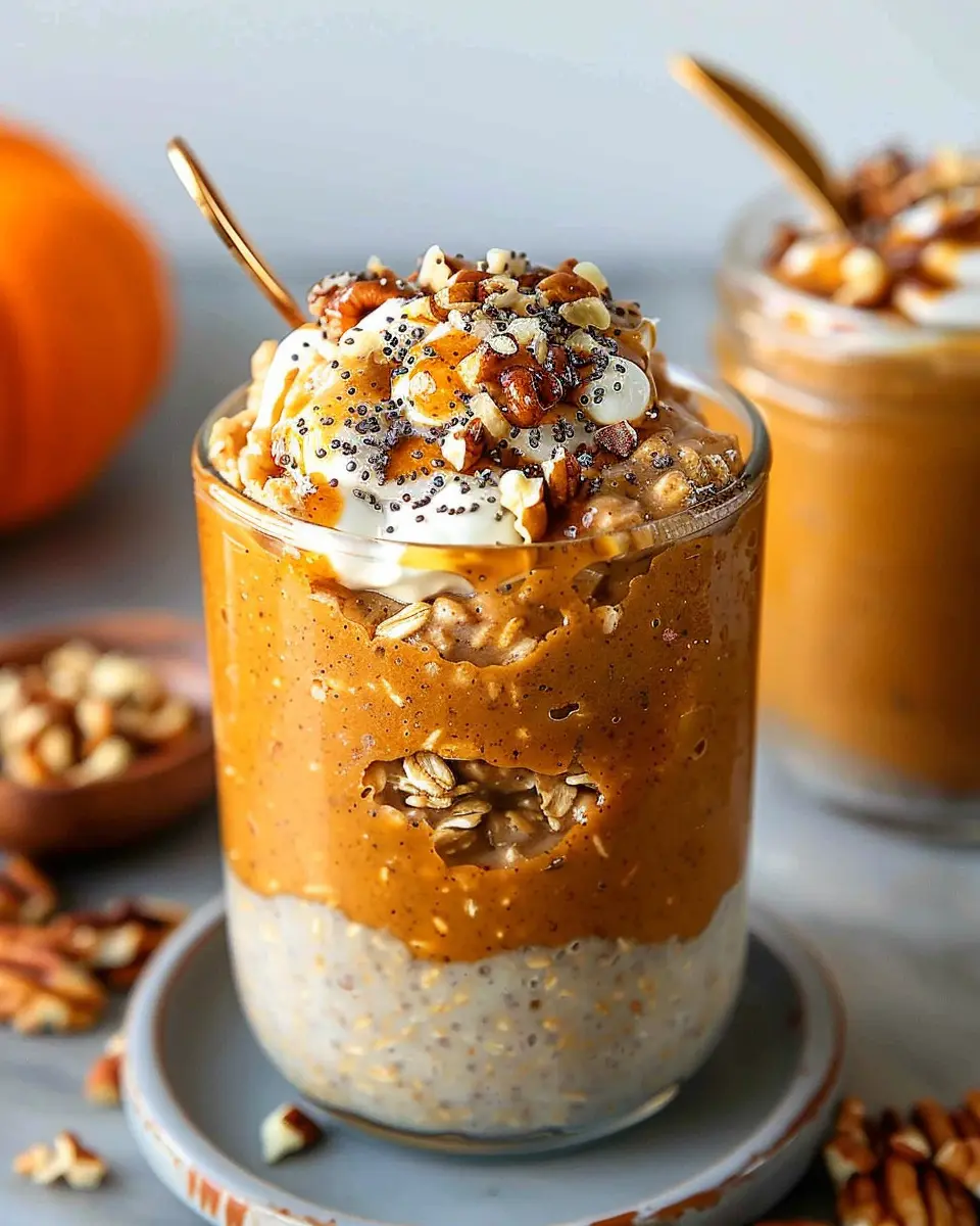 Packed with Protein: Incorporating protein into your breakfast is key to keeping you satiated and energized. Studies indicate that a high-protein breakfast can help reduce hunger throughout the day. With ingredients like Greek yogurt and nut butter, these high protein pumpkin overnight oats offer a hearty dose of morning fuel.