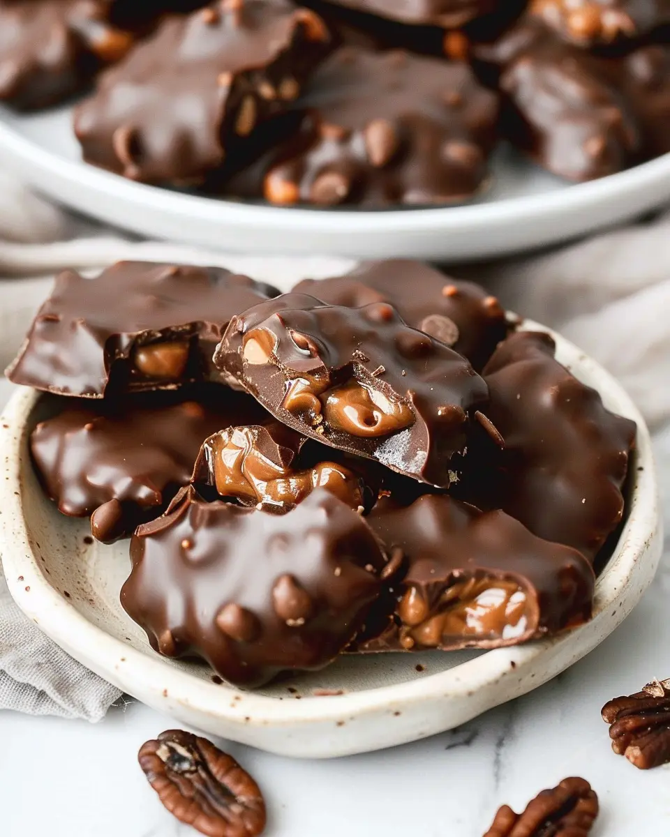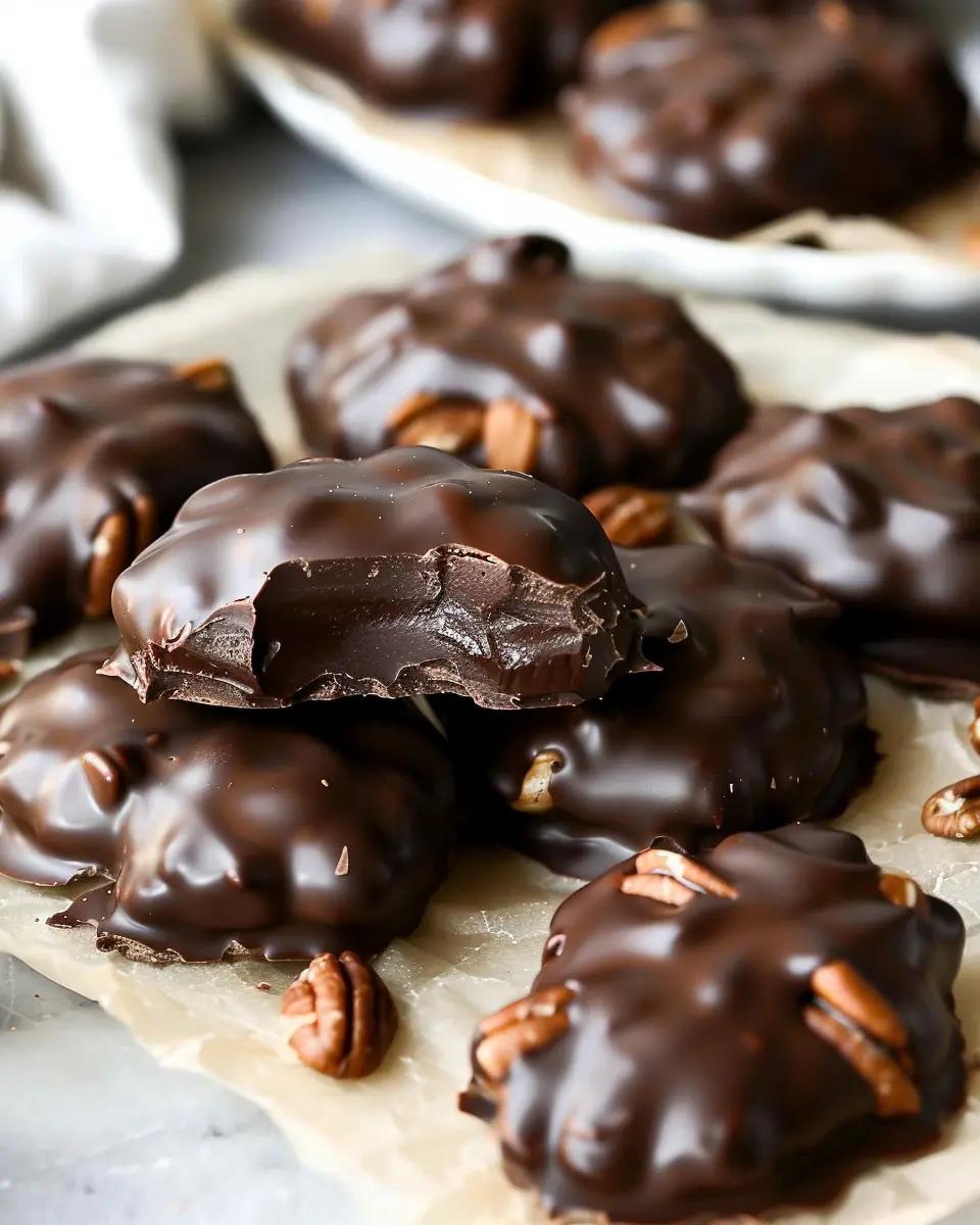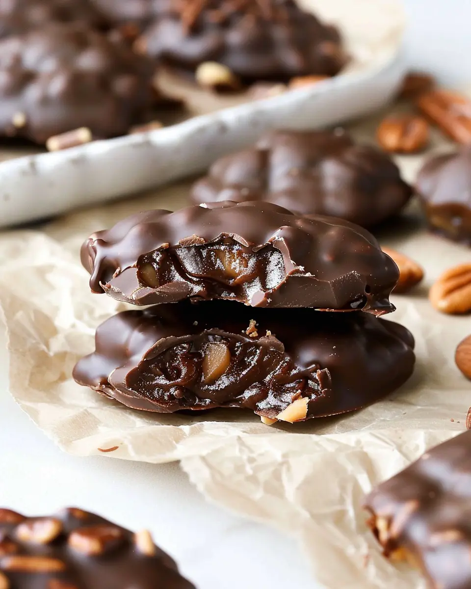 • Instructions: Melt the caramel and drizzle it over clusters of pecans, then coat them in melted chocolate. Allow them to cool on parchment paper.