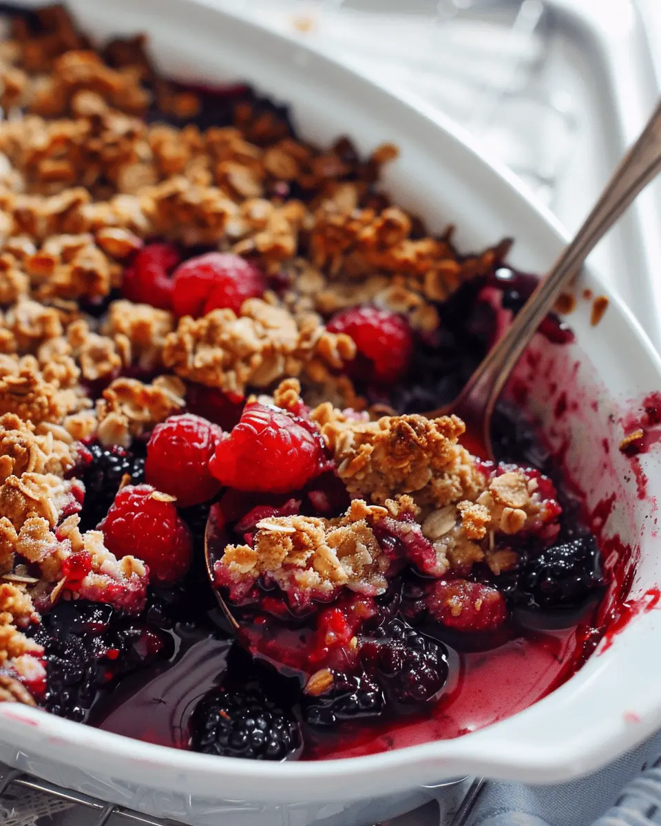 With everything in place, slide your baking dish into the preheated oven and bake for 30-35 minutes or until the topping is beautifully golden and the berries are bubbly. The aroma that fills your kitchen during baking is something you won’t forget, and it’s bound to have everyone running to the oven to take a look.