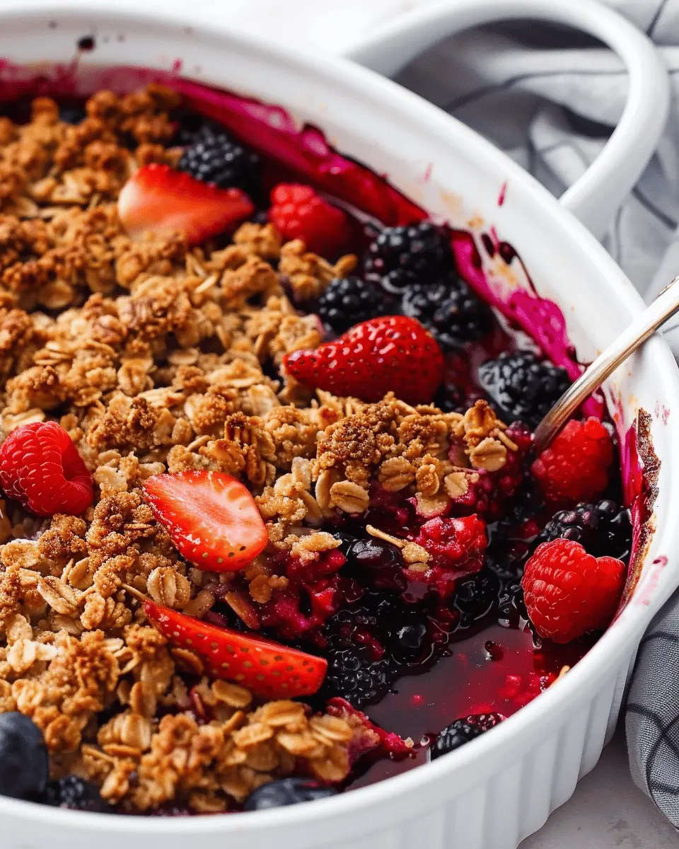 - Ingredients: Use the same berries (strawberries, blueberries, raspberries), but switch the topping to a blend of oats, brown sugar, and coconut oil.