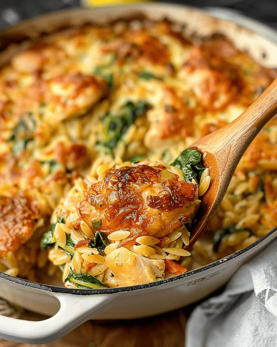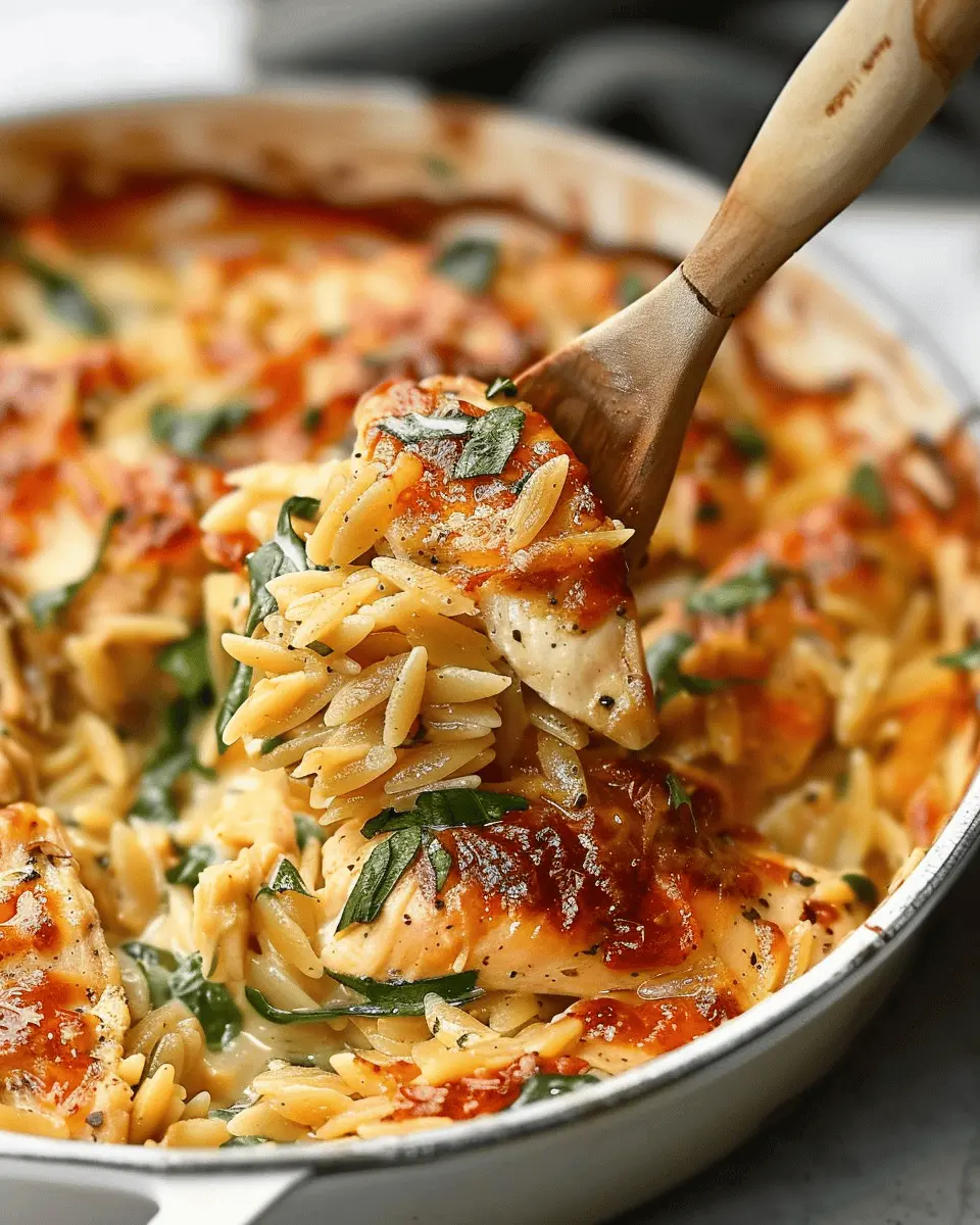 A delicious and comforting one-pan dish featuring succulent chicken and flavorful orzo, perfect for any meal.