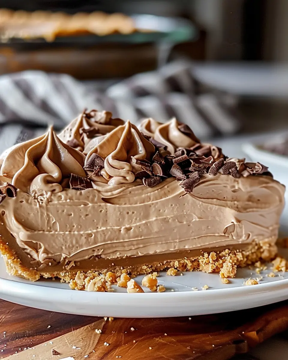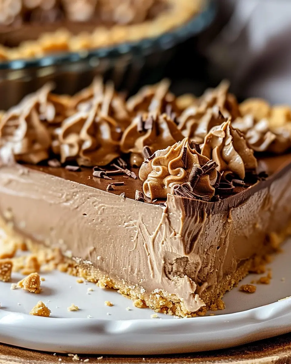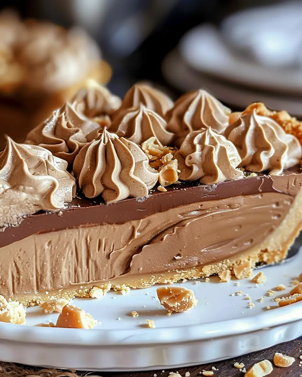 A decadent no-bake pie that combines the rich flavors of cream cheese and peanut butter, topped with a luscious chocolate whipped cream.