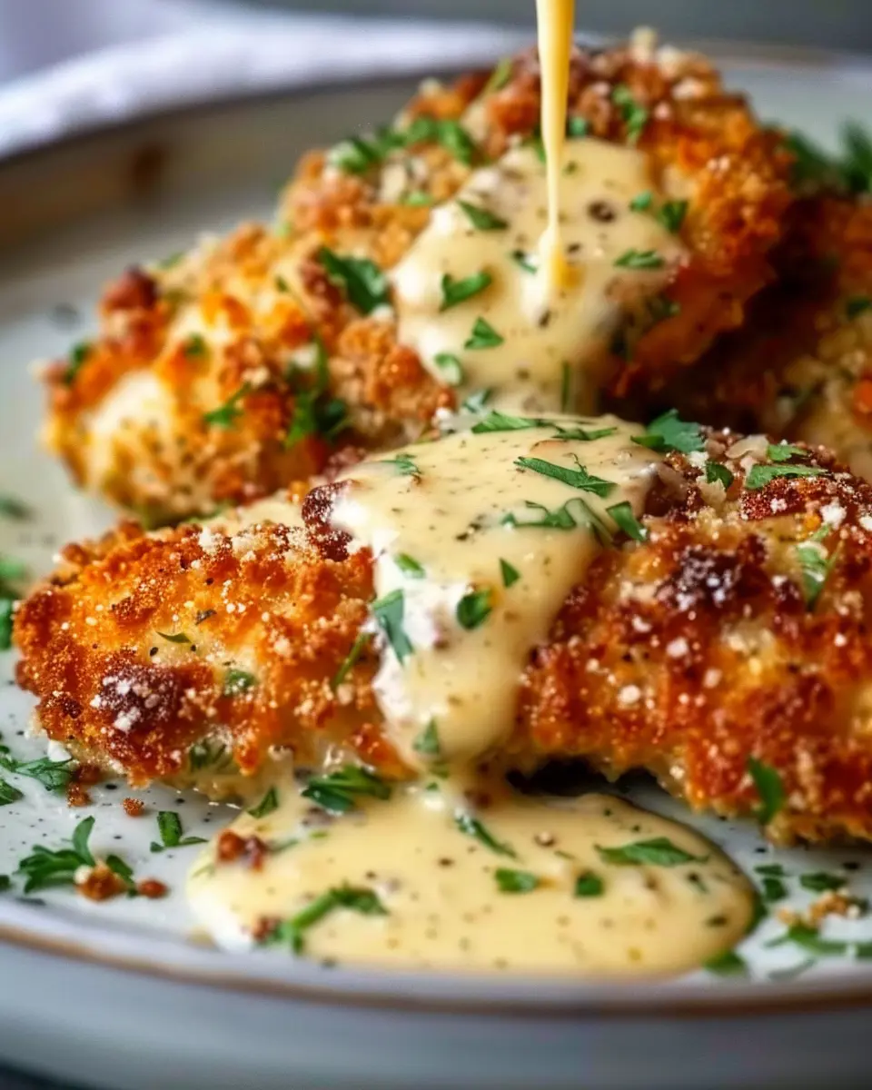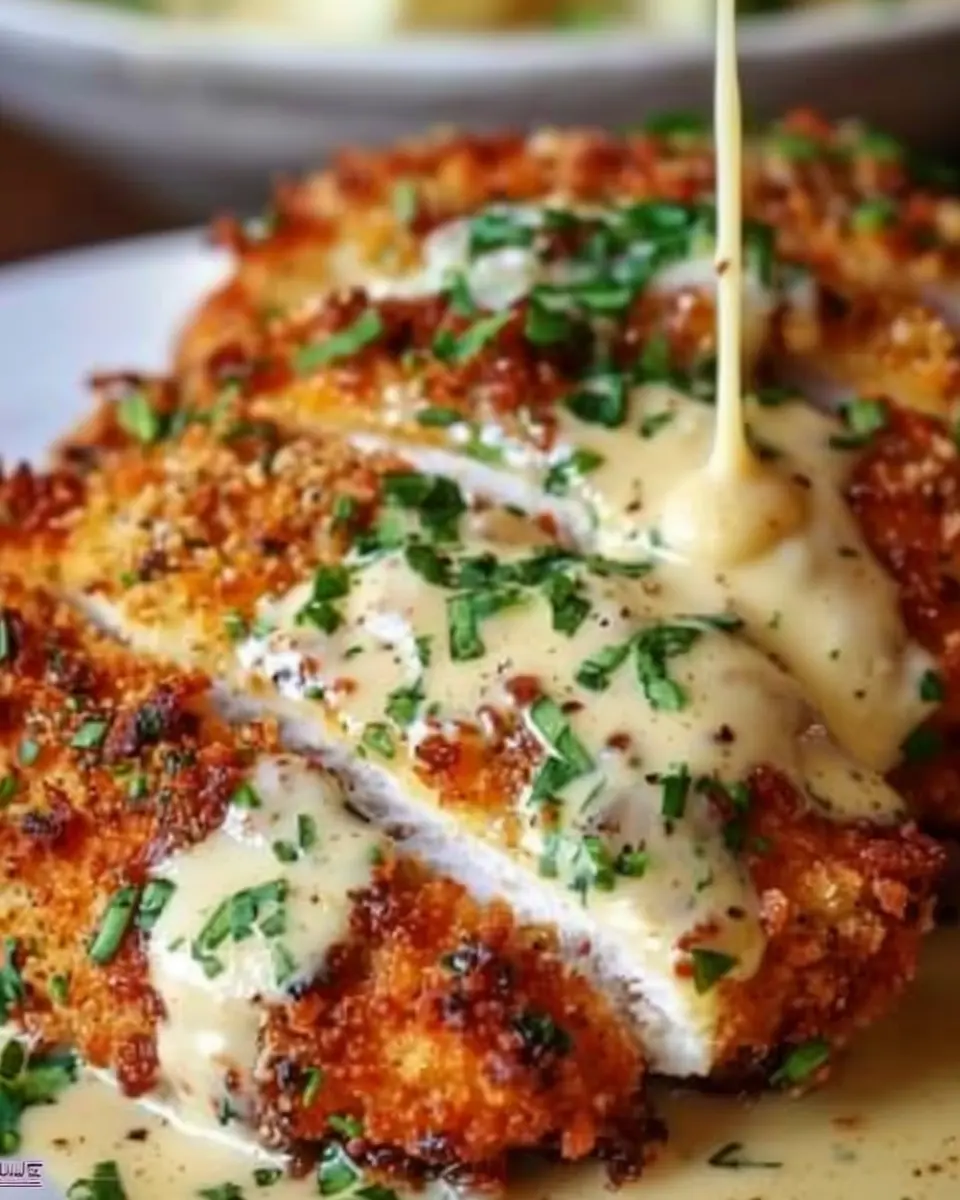 Indulge in this easy and delicious Parmesan Crusted Chicken paired with a creamy garlic sauce that elevates the dish.