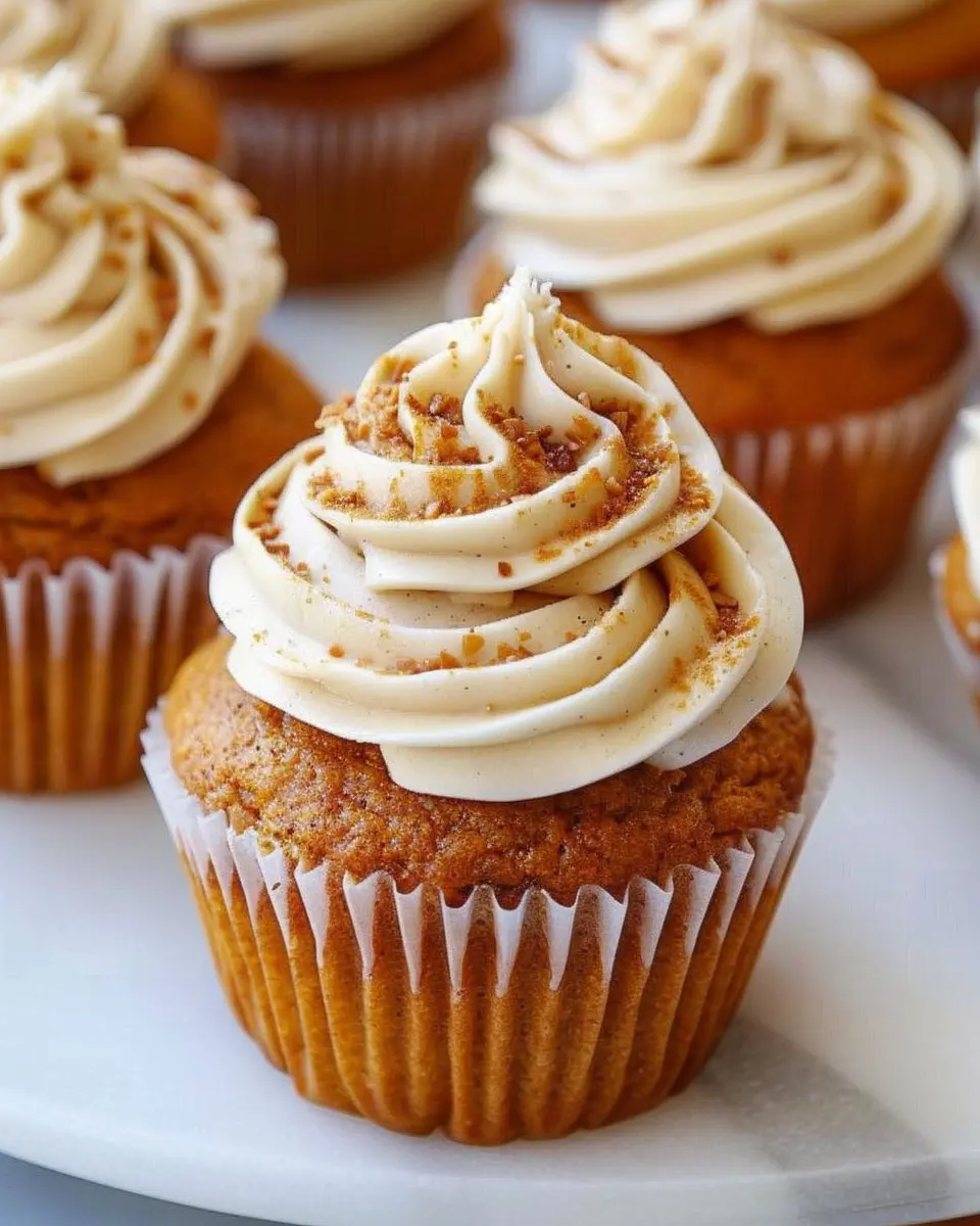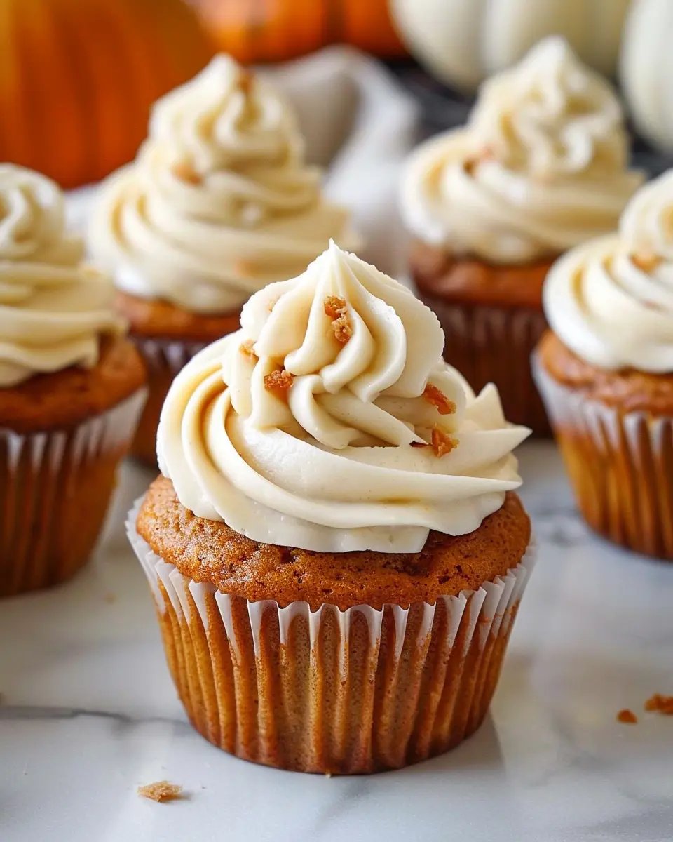 Delicious pumpkin cupcakes topped with rich cream cheese frosting, perfect for fall.