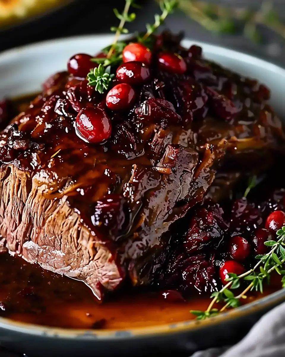 A delicious and savory slow-braised beef roast paired with a tangy cranberry balsamic glaze, perfect for a comforting family meal.