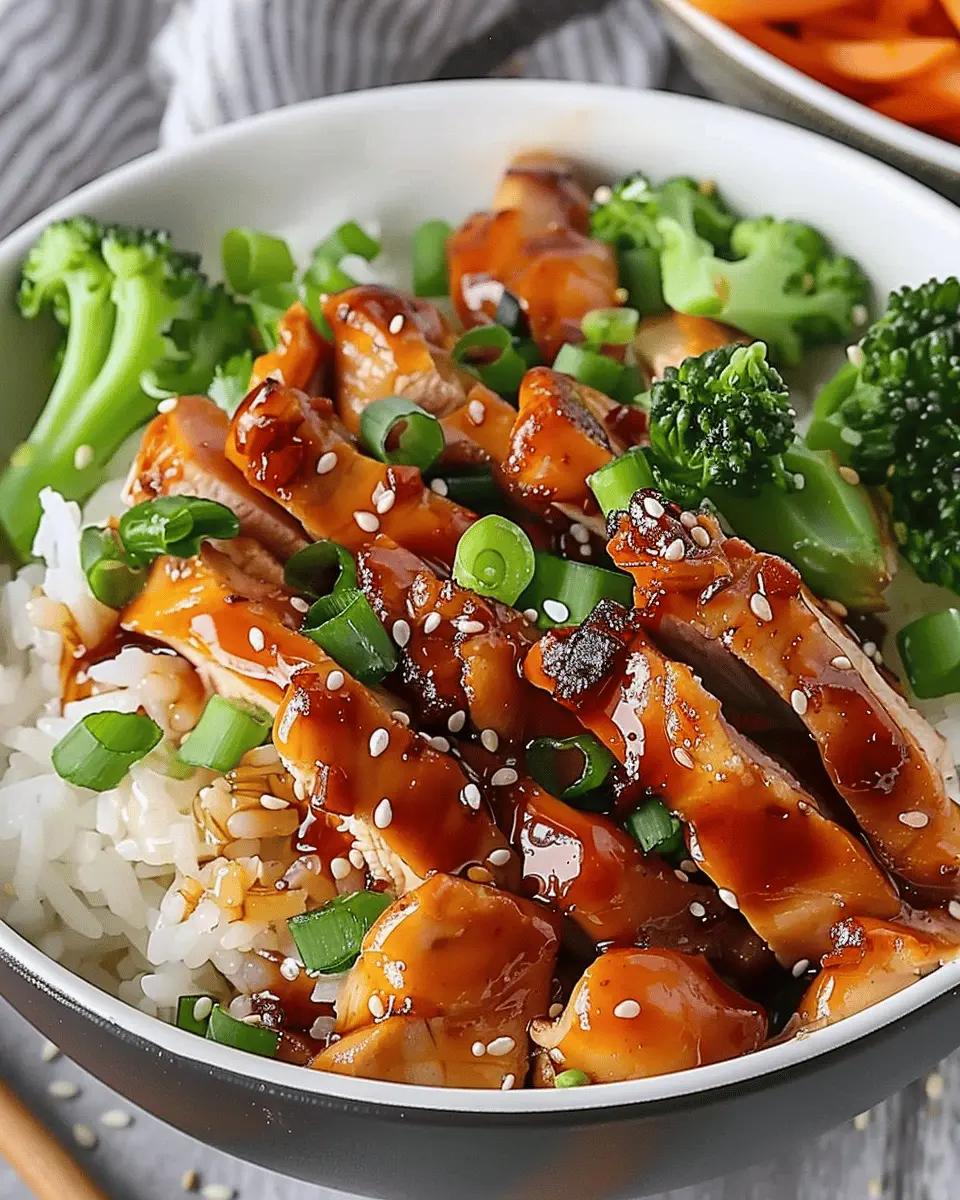 When everything’s ready, serve a generous scoop of rice in a bowl, topped with the teriyaki chicken mix. Add a handful of fresh vegetables on the side to make your bowl colorful and nutritious. Don’t forget to sprinkle toasted sesame seeds and chopped green onions on top for that extra touch!