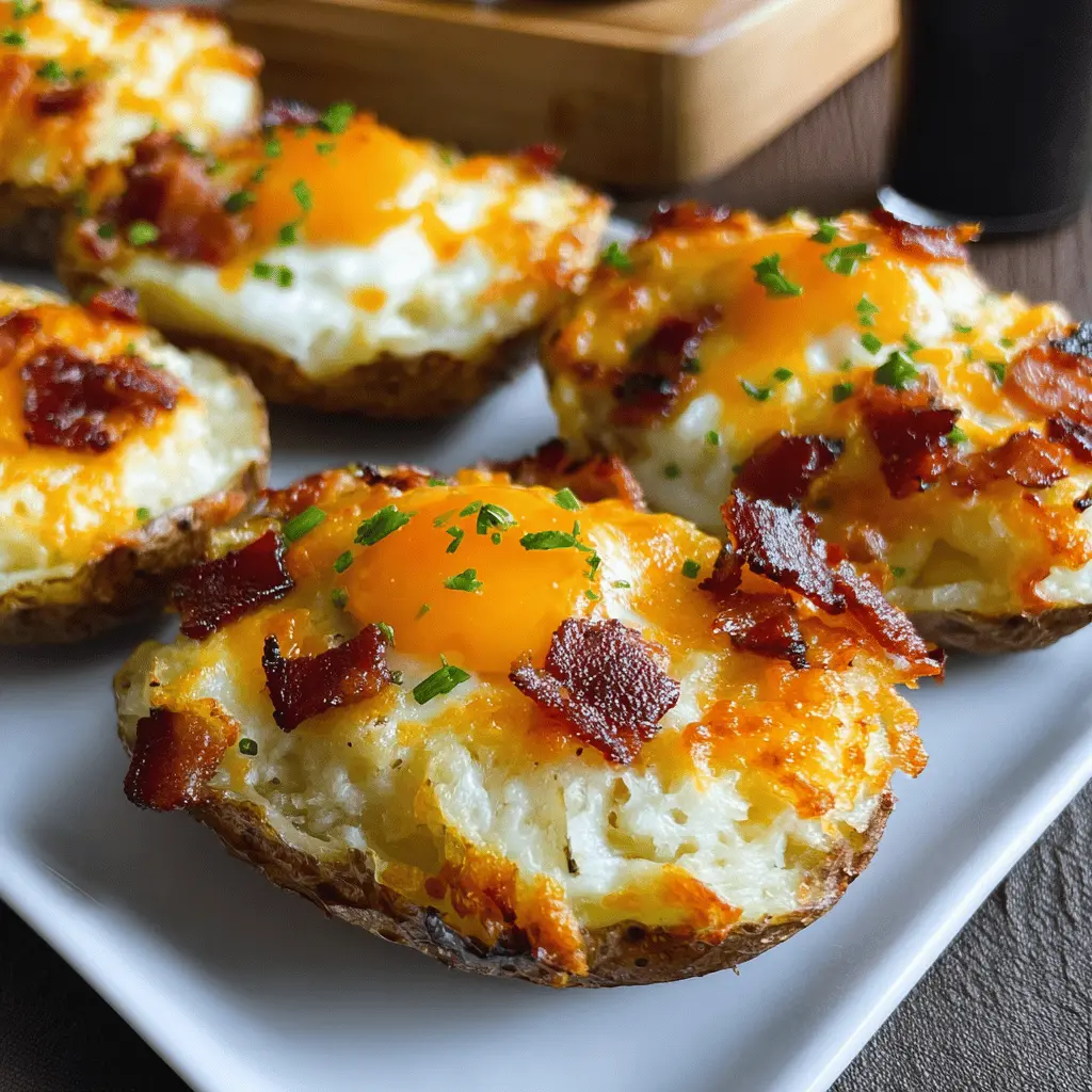 A delicious and hearty breakfast dish featuring twice baked potatoes filled with turkey bacon and cheese.